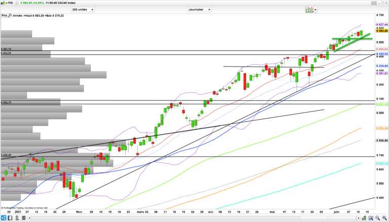 Concernant le CAC 40, ras c’est haussier point barre. on va finir par les avoir les 6666 points. ras au-dessus des 6520 points qui ont donc servi de support hier et qu’on peut donc ainsi considérer comme pivot court terme de la tendance;