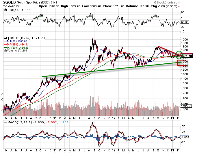 Les cours de l’or vont être à suivre prochainement. Ce qui veut dire que les marchés boursiers seront à suivre puisque des arbitrages costauds auront lieux ces prochaines séances. on peut en effet voir que le l’or se trouve dnas une congestion bien délicate. On peut évidemment encore relancer une hausse en perçant les 1700 dollars, mais si cela ne vient pas très rapidement, l’appel des 1600 dollars se fera pour un nouveau test de l’important support oblique que j’ai noté en vert sur le graphique. On peut voir que toute rupture baissière de ce support oblique, mettrait un terme à la tendance haussière de l’or qui patine déjà  depuis 6 mois dorénavant Attention donc aux investisseurs long sur l’or…