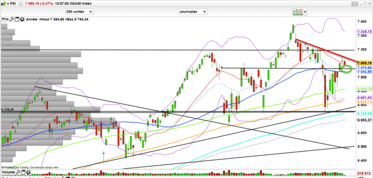 Le cac 40 prouve avoir une bonne pondération pour le marché actuel et reste résilient. Attention toutefois à conserver la zone des 7040 sinon on devrait souffler et continuer le zig zag. Pas grand chose de plus à dire, je continue de penser qu’il faut rester prudent et voir venir mais à ce stade on tient. Ce n’est que sous 7020-7040 qu’il faudra à court terme se remontrer prudent.