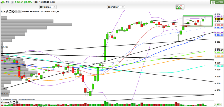 Niveau cac 40, on continue d’être haussier mais à ce stade d’avoir du mal d’aller vraiment beaucoup plus haut. On reste haussier au-dessus des 5600-5630 points à court terme. Au-dessus ras et je dirai même qu’un cac qui est haussier en mode surplace cela continue d’être positif pour le rattrapage de la vieille économie : vous savez celle qui est censé être déjà morte : les cycliques, pétrole en tête. la voie est ouverte au-dessus vers les 5800-5850 si on veut trouver les ressources pour y aller.