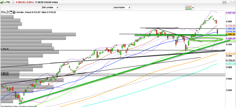 Mais graphiquement à ce stade on a un prorata, un pullback sur les anciennes résistances. Cela manque de contrepartie donc on traverse comme dans du beurre mais on devrait trouver du soutien pour une temporisation dans la zone des 6500-6580 points. Sinon j’ai 6450. Bref, pas de quoi paniquer et parler de krach déjà. On a le prorata suite à un marché monté en ligne droite depuis novembre 2020. Il faut relativiser cette baisse donc et y voir le besoin de souffler et de construire la suite.