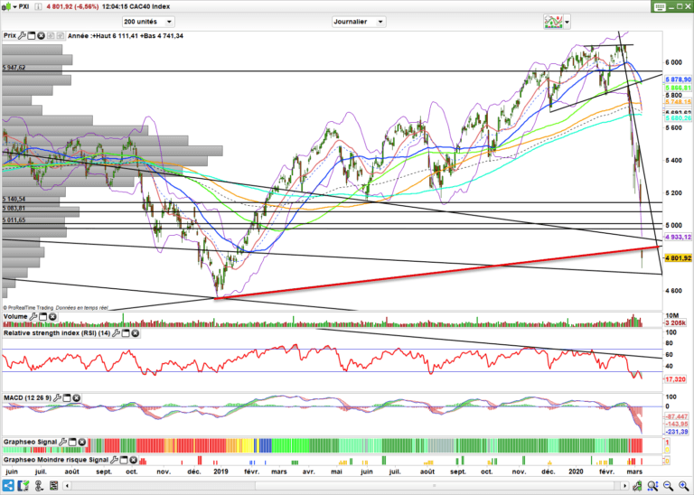 Sur le CAC 40, on est venu chercher l’oblique de soutien peu ou prou avec 4730 points. Bien entendu on n’est pas à l’abri d’aller chercher 4650 si jamais on repasse sous les 4760 à court terme. Mais bon, cette baisse en ligne droite devra bien être corrigée. 4920-5000 seront les objectifs de tout rebond. Car il faut bien se dire que maintenant, plus trop le choix, banques centrales et gouvernements doivent agir et fort. Mais en attendant, volatilité et clairement les opérateurs ont prit une claque et ça va être très mesuré pour la suite.
