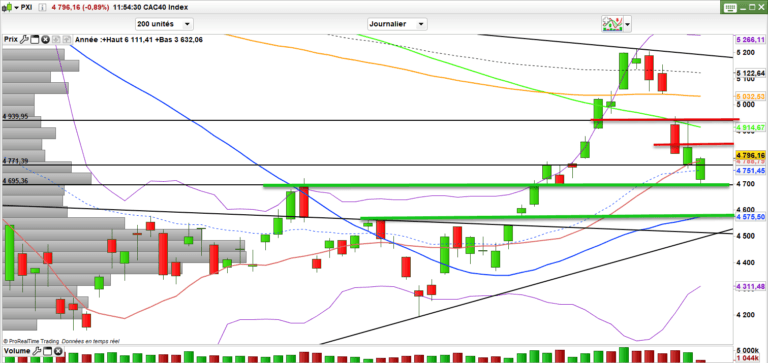 La zone des 4690 a tenu. J’ai hésité à reprendre des positions acheteuses sur ce niveau pour tenter le rebond mais peu inspiré, j’avais laissé traîner un ordre à 53e sur unibail mais je n’ai pas touché malgré qu’on soit allé pile dessus et d’autres plus loin sur les titres volatils pour jouer des rebonds, mais non touchés, sans regret. Pas grave, de toute façon je ne cherche pas à forcer les trader et reste donc ainsi en mode observation.