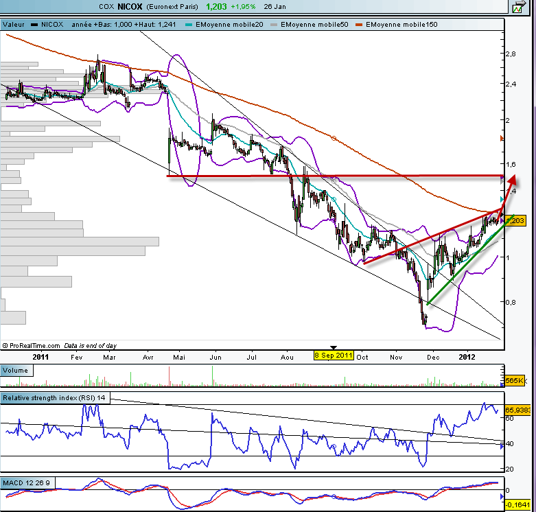 Tout comme Theolia où avenir télécom et bon nombre de petites capitalisations, Nicox se trouve en embuscade sous sa moyenne mobile à 150 jours. Chaque petite capitalisation l’a dépassée dans de gros volumes et surtout de manière fortement haussière avec des +15 à +30 %. Nicox se trouve dans une même situation. Alors aux mêmes causes les mêmes effets ? A suivre. On peut viser 1,50 euros