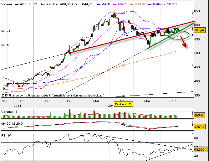 Si vous pensez qu’Apple va baisser prochainement et que vous souhaitez la vendre à déocuvert ou la shorter par le biais d’un dérivé alors il est conseillé soit de shorter sur cassure des 576 dollars soit pour plus de sécurité à la cassure des 570 dollars. L’objectif premier sera un nouveau test des 520 dollars pour un rebond potentiellement uniquement intermédiaire. La prise de position idéale se prend donc sur 570 dollars avec un stop sur 590 dollars.