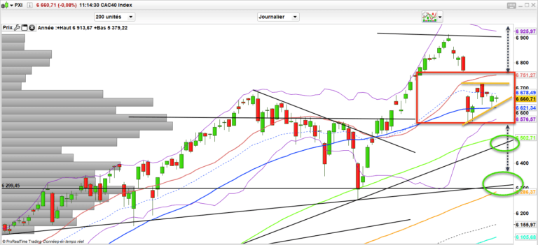 On reste dans une phase de neutralisation court terme, dans un cadre 6570-6770. Il faudra franchir l’une des deux bornes pour donner la prochaine tendance. En attendant sous les 6720 je resterai prudent. On ne sent pas une grosse volonté de rebond et un attentisme certain. Sous 6630 il conviendra de redevenir prudent sur une volonté du cac d’aller chercher à nouveau les 6570. Mais ce n’est qu’en dessous de ce niveau que l’on validerait une volonté correctrice vers 6500-6450.