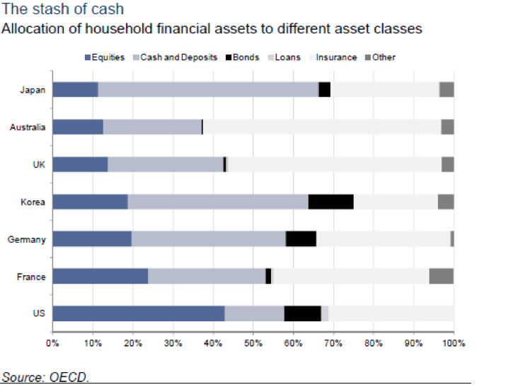 If anything, relative to the rest of the developed world American households over-own stocks and are perhaps equal to the rest of the world in terms of bond holdings. The below chart is Net Worth in Financial Assets by Country, the black portion of the bar is bond ownership and the dark blue is equities:
