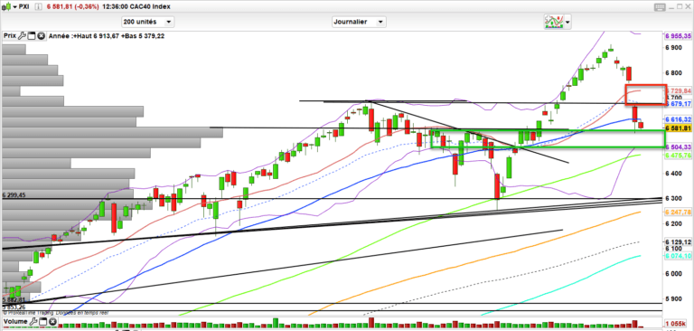 Niveau CAC, on est coincé entre une zone résistance en rouge et une zone de support en vert