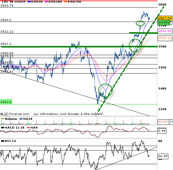 Une temporisation semble nécessaire, au-dessus des 3532 points pour autant elle ne remettra pas en cause la tendance haussière.