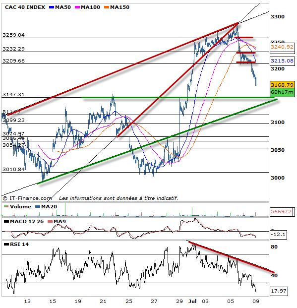 Pour ma part même si je pense le test des 3147 probable et nécessaire pour entrevoir une reprise en main des acheteurs…ou pas, j’ai tout de même lâché mes ventes à découvert ce jour proche de la clôture et commencé quelques achats en vue d’un rebond 3209 points. c’est purement du trading, et les investisseurs sont conseillés de restez à l’écart sous 3232 en attendant d’avoir une configuration plus claire à exploiter.