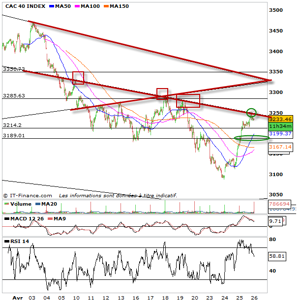 Le CAC 40 confirme son rebond haussier engagé hier par la rupture des 3190 points, il va même au delà de mon idée en cassant les 3205 puis les 3211 points pour aller venir tester directement l’oblique baissière de la tendance moyen terme avec les 3250 points. l’oblique baissière est très importante pour le marché, celle-ci fut longtemps résistance, et lorsque nous avons tenté un premier rebond sur 3290 la semaine dernière, c’est elle qui a fait échouer les acheteurs et relancée la baisse. un peu de résistance devrait donc avoir lieu. L’occasion de croire à une consolidation. cependant je ne pense pas qu’une relance baissière se fera, je pense que le marché consolidera pour mieux dépasser cette oblique et valider un objectif haussier plus important dans la zone 3330-3350 points. C’est pourquoi je n’ai pris que la moitié de mes profits en fin de journée, le reste pour voir, si consolidation, les liquidités pour reprendre des actions.