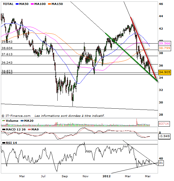 Tendance baissière pour Total également dans un biseau descendant est arrivée en test de supports horizontaux importants. Je passe en opinion haussière sur un dépassement des 35,40 uniquement cependant ce qui permettrait de lancer un rebond haussier durable vers 36,20-37-60 euros. Sur le rsi on retrouve également une attaque de la tendance baissière majeure de ces derniers mois. L’occasion donc de voir si les acheteurs sortent du bois ou non si au contraire comme sur toutes les autres valeurs et donc le cac 40 on lance plutôt un sell off généralisé.