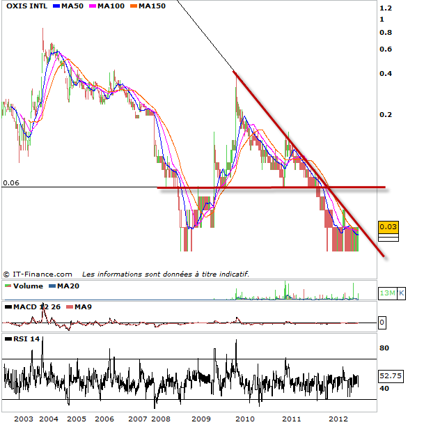 Si vous avez de l’argent en trop ou que vous aimez l’adrénaline, il pourrait bien avoir dans l’action Oxis ce qu’il vous faut. La valeur ne peut pas réellement baisser plus et le passage des 3 centimes d’euros pourrait libérer un potentiel ultra spéculatif sur 0,06 euros voir plus. par l passé on y a déjà eu droit. Donc c’est un peu comme le loto. si vous avez 500 ou 1000 euros à perdre ça peut valoir le coup de s’offrir un peu de d’adrénaline.