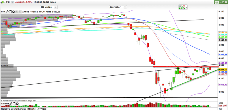 En effet, dans la zone 4420-4440 on a une belle zone de soutien, au-dessus le mouvement initié vendredi tient bon mais on sent bien aussi qu’il y’a beaucoup de prudence et d’attentisme. Notamment sur les niveaux atteint par les us.