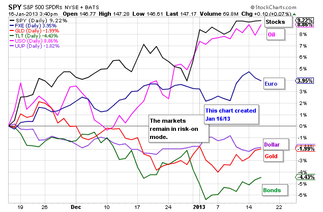 Voici un tableau qui récapitule et compare la performance des actions, de l’or, des obligations, du pétrole, du dollar et de l’euro. on peut voir que si clairement les investisseurs sont décidé depuis novembre 2012 d’aller chercher de la performance dans les actifs à risque, il reste néanmoins une certaine couverture contre le risque. C’est ce qui prouve une fois de plus la croisée des chemins dans laquelle nous nous trouvons et l’indécision qui domine en ce début d’année alors que le monde est plein de liquidités qui n’attendent qu’un catalyseur pour savoir où s’investir et former une nouvelle bulle. Par déduction, certains pensent qu’il ne reste plus que les actions car l’or est en bulle, les obligations sont en bulle…alors ?