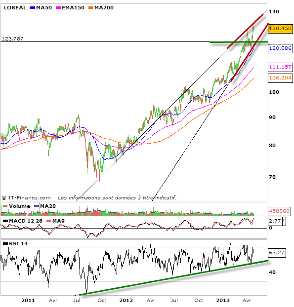 Il faut également noter, que le cac 40 est fortement pondéré en valeurs bancaires comme BNP, Société générale et Crédit Agricole. Or ces valeurs, si elles ont rebondi, reviennent de loin. La majorité des valeurs du cac 40 sont dans des figures haussières, voir même en surchauffe elles aussi. on retrouve de nombreuses hausses paraboliques dans des biseaux ascendants.