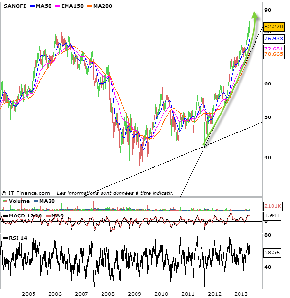 Alors que le cac 40 semble se préparer à nous offrir les 4000 points, beaucoup d’investisseurs demeurent à la croisée des chemins. Les indices américains et japonais sont clairement en surchauffe. Pourtant, rien ne semble les arrêter alors même que le mois de mai d’apprête à débuter. Il faut dire que si l’on regarde notre CAC 40, il faut éviter de se méprendre. A première vue l’on pourrait penser que le cac 40 a beaucoup de retard sur la hausse des marchés américains. Mais lorsque l’on regarde la côté et que l’on analyse ses différentes actions, on se rend compte que bon nombre de titres sont déjà au-dessus de leurs sommets atteints en 2007 voir même de 2000. La raison en est simple et tient à la pondération des actions au sein du CAC 40. Si l’on regarde les deux plus grandes capitalisations boursières du CAC 40, Sanofi est le bon élève, mais la performance de Sanofi est amputée par la piètre performance de Total.