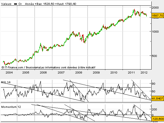 Remarque n°1: Actuellement comme en 2008, on peut noter la formation d’un biseau descendant, sur le RSI et le Momentum. « Sous remarque » on peut observer au passage une incroyable symétrie de ces biseaux sur le RSI.
