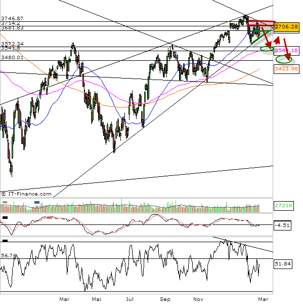 Les vendeurs pourront dès lors rapidement aller chercher les 3575-3550 points avant certainement une nouvelle résistance des acheteurs et donc un rebond.