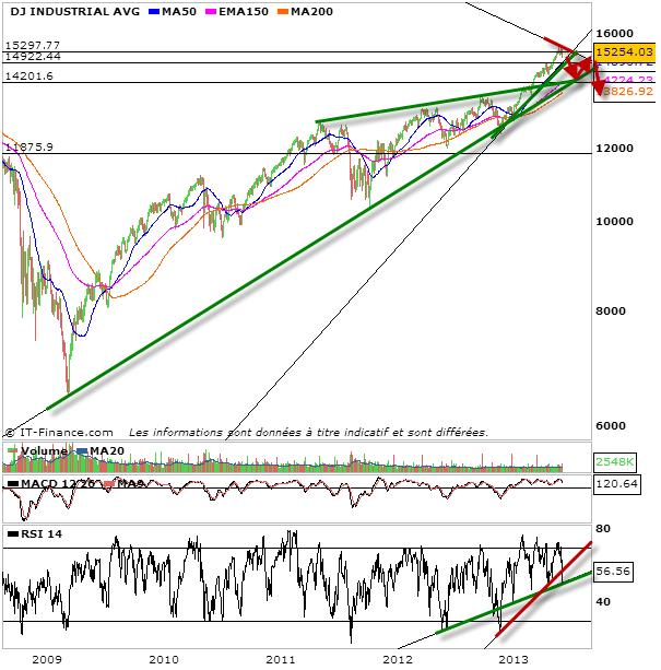 j’ai beau être un éternel optimiste, j’ai du mal à croire que le marché puisse retrouver une dynamique haussière. Pour moi le mal est fait, et les acheteurs dorénavant ne devrait pas être capable de faire plus que des rebonds techniques. A l’image de ce soir, il faudra éviter de se lancer trop vite et de se faire piéger. Si le rebond peut sembler conséquence, en tout cas sur le dow jones,il ne faut pas se tromper sur la big picture qui est que sous 15300 points, tout rebond, n’est que technique et ne remet pas en cause la phase de consolidation qui se met en place…doucement. En effet sur le graphique j’ai apposé les deux obliques haussières. la plus obtus craquera bientôt. Je penche pour une consolidation pour la tester prochainement, puis un rebond mais qui ne permettra pas d’endiguer la consolidation et ce sera le véritable signal de correction par la suite. Le marché forme un top. Et plus la tendance auparavant était forte, plus ce top sera long à mettre en place. il n’y a qu’a regarder du côté de l’or pour s’en convaincre. Ce qui est certain c’est que je vois mal comment le dow jones ne pourrait pas corriger cette hausse exponentielle.