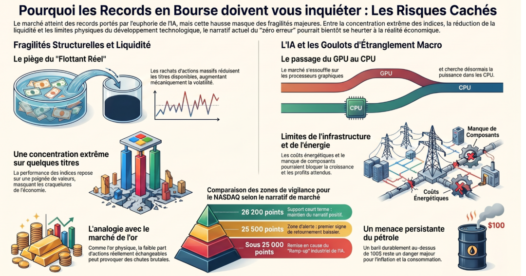 Les indices boursiers enchaînent les records, mais cette euphorie masque une fragilité inédite. Piège de liquidité des GAFAM, mirage de l’IA et Fed sous influence : analyse d’un marché au bord du gouffre.