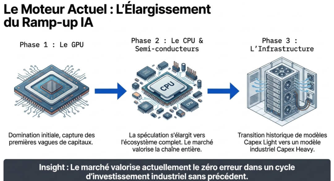 Le narratif de l’Intelligence Artificielle est en train de pivoter, délaissant l’unique obsession pour les GPU de Nvidia au profit de la puissance CPU. Le marché joue désormais la rotation vers AMD ou Arm, car le besoin de calcul pur devient le véritable goulot d’étranglement des infrastructures. Cette translation sectorielle permet aux indices de se maintenir aux sommets alors même que les leaders historiques commencent à saturer.