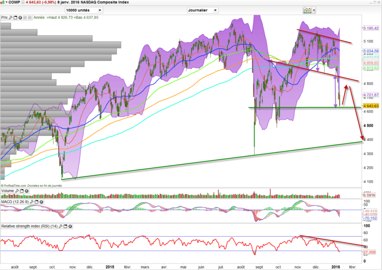 Après la semaine de panique baissière que nous venons de vivre, je pense important de faire le point essentiellement sur le CAC 40 et les indices américains. Quelle semaine. Plusieurs gaps baissiers importants, des volumes importants, des indices incapables de tenir un rebond. Bref, la tendance baissière que l’on pouvait redouter en demeurant sous 4750 trop longtemps s’est transformée en une panique baissière. Plus d’acheteurs, ils capitulent. Bien entendu, l’excès vendeur sera corrigé. Mais les niveaux de rebond dans une panique sont compliqués à entrevoir.