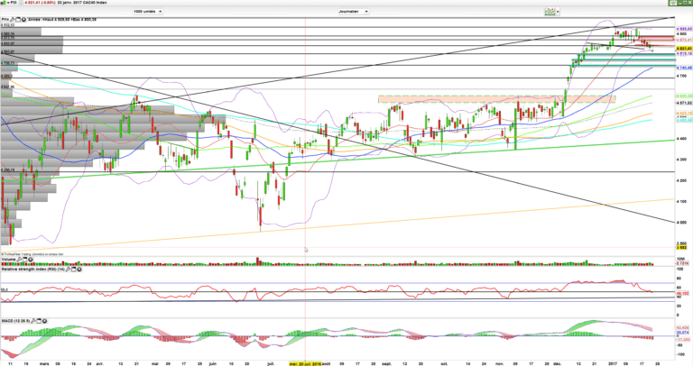 Ainsi on va retrouver outre les 4800 points, les 4790-4780 ainsi que les 4770 et 4750 points en support, sans oublier la moyenne mobile à 50 jours, montante qui ne manquera pas de venir se jumeler à une de ces zones de support et donc la renforcer.