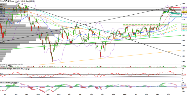 Même si au-dessus des 4856-4850 points on demeurera haussier. Mais sous 4850-4856 les choses pourraient rapidement s’accélérer. Déjà avec la fermeture du gap sur les 4830 points, ce qui enverrait un nouveau signal de faiblesse et puis avec la rupture des 4800, la confirmation d’une volonté d’aller chercher la moyenne mobile à 50 jours qui se trouve dans la zone des 4750-4770 qui s’annonce comme pivot.