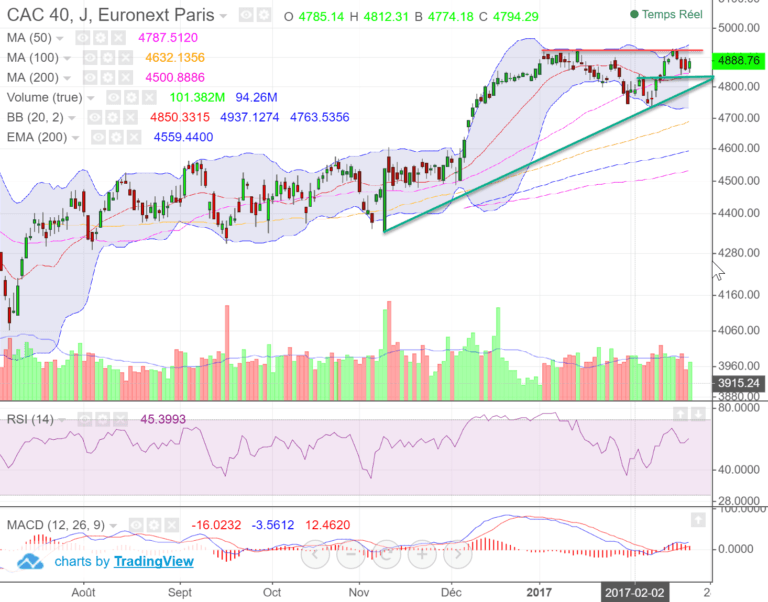 On observe donc toute cassure des 4900 qui permettrait de relancer l’attaque des 4930 points. C’est la cassure des 4930 points qui nous permettra de viser un nouveau plus haut sur le CAC 40 avec l’atteinte des 5000-5020 points.
