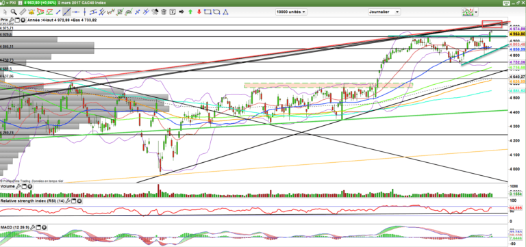 Je continue de penser que l’on évolue dans un biseau ascendant de résistance 5000-5020 qui sont les prochains objectif tant que nous demeurons au-dessus des 4930 points.