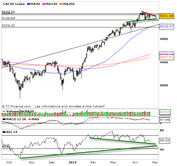 Nouvelle séance de temporisation pour le CAC 40 qui ne parvient pas à conclure et à choisir une sortie. La tendance à court terme est donc parfaitement neutre, pas de décisions. Le marché valide avec grand intérêt la figure en triangle symétrique au point près, proposée depuis plusieurs jours. On vient buter contre la résistance aujourd’hui autour des 5220 points. La figure est maintenant très resserrée. Le verdict est proche et avec lui le retour de la volatilité. Autant dire qu’il va falloir se préparer à être réactif. On a encore pas mal de résultats qui vont tomber et qui peuvent donc encore jouer le rôle de catalyseur à la hausse mais honnêtement je n’y crois pas. Je pense que le potentiel de gain est ridicule comparé au risque de perte dorénavant. La plupart des gérants ont fait leur performance annuelle en 3 mois. Personne ne va chercher à grappiller mais plutôt à sécuriser. Pour moi le moi de mai mettra un terme à la hausse telle que nous la connaissons depuis le 1er janvier 2015 en envoyant le CAC 40 en correction sous les 5000 points. Déjà cette semaine nous démontre la faiblesse des acheteurs. S’ils ne craquent toujours pas, ce n’est maintenant qu’une question de temps. Au niveau des US et du Dow Jones nous sommes également sur des résistances obliques au niveau des prix et du rsi que j’affectionne particulièrement. Sans pour autant remettre en cause la tendance haussière long terme qui perdurera, le mois de mai devrait voir l’arrivée d’une forte correction.