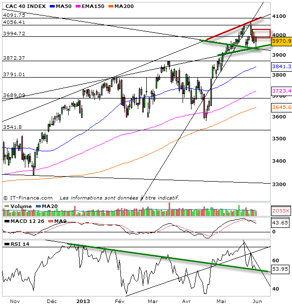 Voilà donc le dernier jour du mois de mai. L’occasion de faire un point sur les marchés et donc sur le cac 40 qui n’aura pas souffert du sell in may and go away puisque la tendance haussière en aura profité pour s’affirmer. Cependant ces dernières séances on ne peut que constater que le mouvement acheteur perd de sa superbe. Cela ne veut pas dire qu’il faille tirer un trait sur la tendance haussière à long terme, elle a l’air solidement ancrée, mais cela veut dire qu’a court terme dorénavant ce marché doit souffler et donc consolider. Nous avons eu confirmation aujourd’hui avec la rupture des 3956 points. On termine la séance non loin. Ainsi les vendeurs semblent de plus en plus réussir à faire baisser le marché avec facilité alors que les acheteurs galèrent à le faire remonter. Pour moi, c’est là le signal que les acheteurs sont entrain de s’épuiser à maintenir le marché. Lorsque les acheteurs n’auront plus de cartouches, le marché sera prêt à consolider. une rupture nette des 3956 points puis des 3940 engagerait le cac sur la voie des 3875 points.