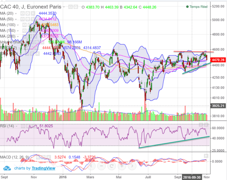 L’épisode des emails de Clinton vient de créer une nouvelle incertitude à court terme qui s’est confirmée aujourd’hui par la cassure du support des 4500 points. Support maintes fois testés ces derniers jours et qui aura donc fini de craquer en cette Toussaint.
