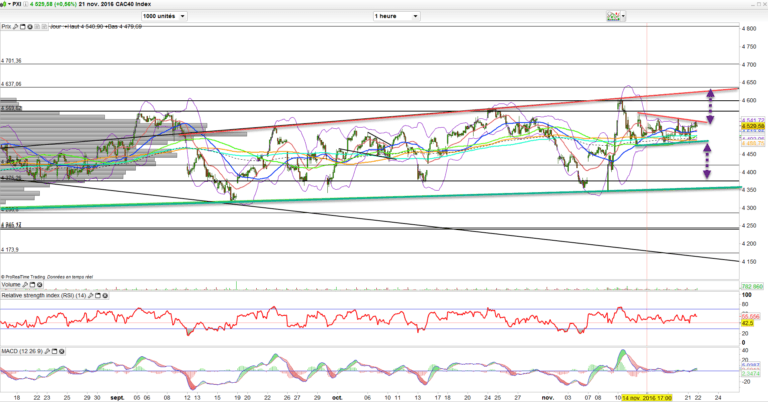 une nouvelle fois aujourd’hui nous avons testé les deux bornes, support et résistance mais nous clôturons au-dessus des 4510 ce qui est très encourageant pour la suite.