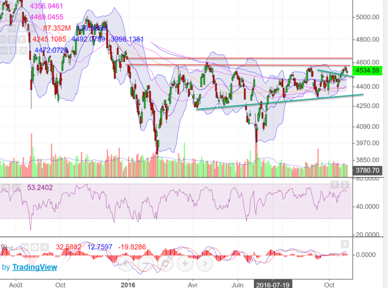 Les 4500 sont donc support, et au-dessus la baisse de ces derniers jour n’est que consolidation. Il n’y aura donc échec et correction baissière que sous 4500 points.
