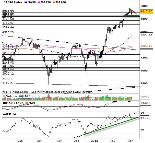 Je suis partagé sur la séance du cac 40 aujourd’hui. Le CAC 40 a validé le pullback par deux fois en étant incapable de repasser au-dessus des 4900 points avant de le faire dans la dernière séance. Les acheteurs ont donc réussi à rebondir sur les 4860 points puis en s’affranchissant des 4900 à mettre un terme à la correction pour revenir dans une situation neutre. En clôturant au-dessus de la zone des 4900-4910 points, les haussiers ont repris la main. Il leur faudra confirmer demain en franchissant les 4920 puis 4930, mais la route sera dès lors ouverte pour les 5000 points. Seul bémol, les US, eux ont validé leur correction, à moins qu’ils nous fassent eux aussi une invalidation avec un fort rebond en séance aujourd’hui, mon coeur penche toujours vers la baisse. mais seul le marché à raison et donc à nouveau au-dessus des 4900, les haussiers reprennent la main. 4900 reste donc la zone pivot. Au-dessus, on privilégie la hausse, en dessous, la baisse. On a donc eu droit à un rbeond sur l’oblique haussière du rsi en vert, tant que cette oblique n’est pas cassée à la baisse on peut dire qu’il n’y aura pas de correction vers les 4800 points. Je pense que le meilleur moment pour vendre à découvert est maintenant très proche, mais au-dessus des 4900 il faut se méfier et ne pas faire comme moi qui ai trop anticipé.