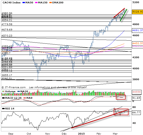 Séance de consolidation sur le CAC 40 mais pas de rupture. En effet à la clôture ce soir, le CAC 40 reste neutre en ayant sauvé les 5010 points ce jour. Par contre on se retrouve coincé entre 5010 et 5040 points. de la sortie de cet espace se déclinera donc la suite. Sous 5010 points, une correction se mettra en place vers les 4850 points. De là le rebond pourra certainement nous donner une épaule tête épaule à confirmer, j’extrapole. En attendant, pour demain, si on passe les 5040, reprise de la hausse; mais je doute que l’on aille bien plus haut dorénavant. Si cassure des 5010, on valide la correction et doucement mais surement se diriger vers les 4970-4950. Donc verdict demain et confirmation jeudi avec réunion FED ce soir et demain en guise de déclencheur.