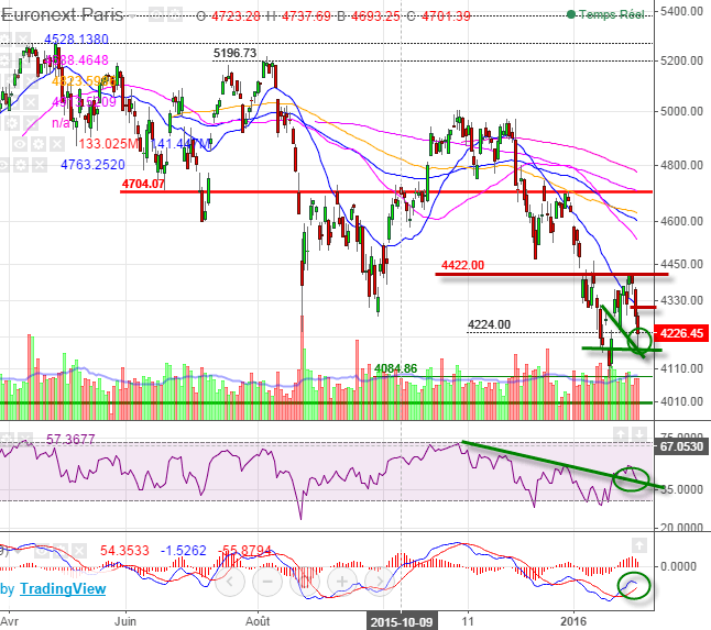 Poursuite de la baisse du CAC 40 après un échec à s’affranchir des 4290 points. Pour autant, je pense que la séance est des plus intéressantes et qu’il faut penser à accumuler en vue d’une reprise du rebond. Explications: