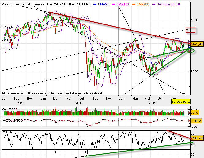 Je ne l’ai pas tracée ici non plus pour ne pas surcharger le graphique. Mais le cac évolue lui aussi dans une figure dans la figure. On retrouve un plus large triangle de support 3050, si vous reliez les points les plus bas de 2011 et 2012 entre eux, vous obtenez le support majeur tout comme sur les marchés américains.