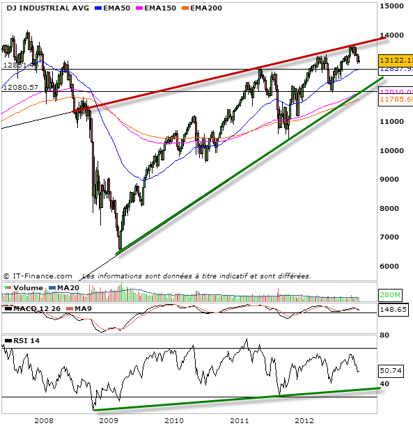 A court terme, la consolidation a déjà débuté depuis la rupture baissière des 13350 points. Vendredi, le dow jones fut incapable de rebondir franchement en rompant les 12290 points. Si bien que le risque à court terme est de rompre les 13090 points et donc de lancer cet épisode correctif vers les 12850 en premier lieu.