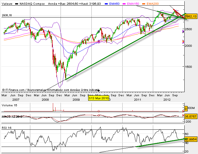 Je ne l’ai pas tracée. Mais tout comme le dow jones, le NAsdaq évolue dans une figure qui évolue elle même dans une figure. Si à court terme, le nasdaq choisi de rompre 2940 points et donc de lancer un mouvement correctif. Il devrait être supporté par les 2620 points.