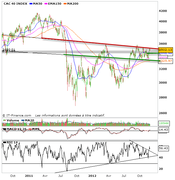 Tant que les 12900 points sur le dow jones et les 3480-3487 points tiennent sur le CAC 40, on est toujours dans une poursuite de la tendance haussière sur le cac 40. Cependant, à l’image de la séance du jour on voit bien que la résistance des 3530 points est importante et que des vendeurs la défende. Après une belle hausse, il semblerait logique que les acheteurs manquent un peu de jus pour franchir cette résistance ci-. Une consolidation serait saine. C’est ce que je privilégie, une attaque des 3457 points. De plus, niveau action, j’ai du mal à trouver chaussure à mon pied, peu de signaux. Alors je continue d’attendre.