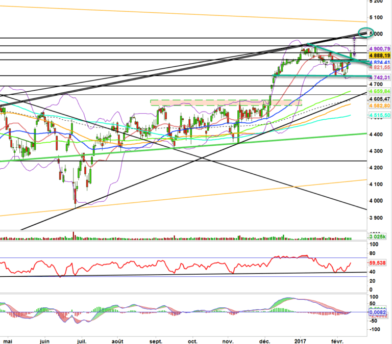 Dorénavant donc on reprend un biais haussier et on le gardera tant que les 4830-4850 seront support. la voie des 5000 tant que l’on reste au-dessus de cette zone est donc maintenant ouverte.