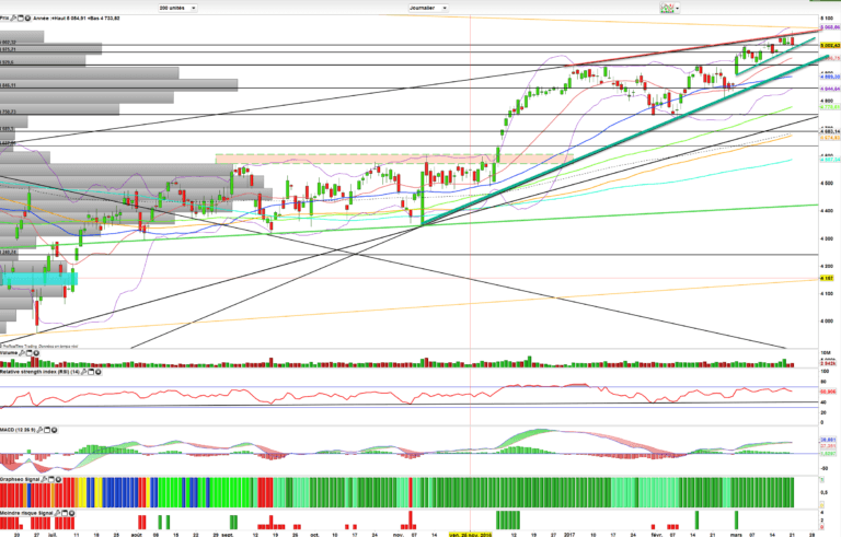 Le doute sur le CAC 40 s’est peut être transformé ce jour en un début de consolidation. En effet depuis plusieurs jours je vous montre que le CAC 40 évolue dans un biseau ascendant à l’intérieur lui même d’un plus grand biseau ascendant.
