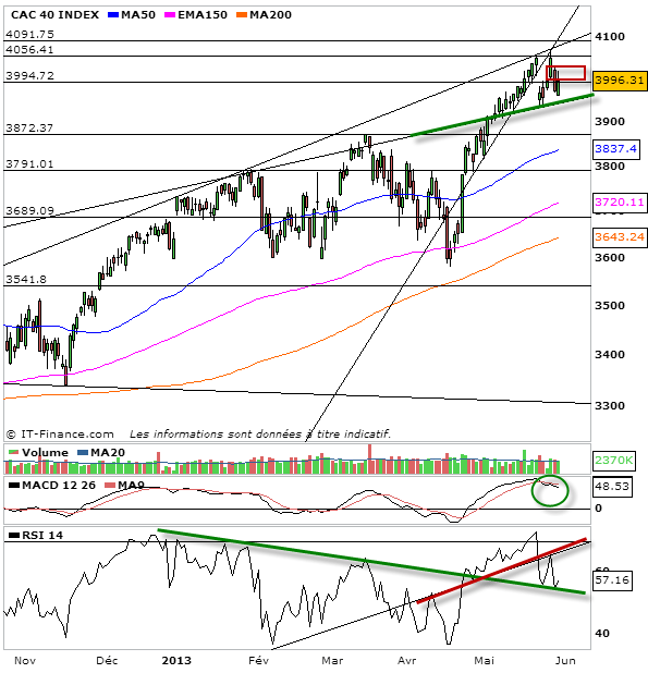 Nouvelle séance du cac 40 à faire le yoyo, tout du moins en apparence. Si le cac 40 semble en apparence toujours monter ou résister à la baisse, cela ne me parait être qu’en apparence. En effet on remarquera que dorénavant, chaque hausse du cac 40 se fait dans la difficulté et ne tient pas longtemps. Ce marché se cherche. Cette hausse, se débat, s’essouffle. Mais c’est bien les baissiers qui continuent de marquer des points, avec des points hauts du cac qui ces dernières séances se font de plus en plus bas. Le plus intéressant à suivre sera au niveau du rsi. Comme j’ai pu l’annoter déjà depuis quelques séances, on a eu droit à notre pullack et c’est en cela que je pense que le cac 40 est entrain de former une figure de top de marché. Maintenant après 9 mois de hausse non stop, il est normal que cela prenne du temps et que les acheteurs ne lâchent pas si facilement l’affaire. ce qui sera important pour donner le coup de grâce, c’est la capacité des vendeurs à pouvoir rompre par le bas 3956 points et donc l’oblique support en vert sur le rsi. De là viendra la vraie correction…mais en attendant, on se cherche dans une neutralité, et donc un yoyo.