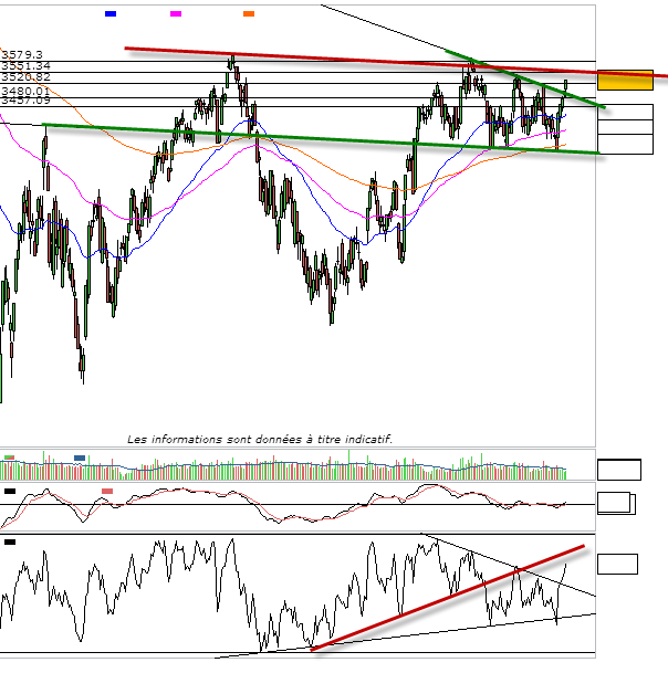 Opinion haussière court terme au-dessus des 3480 points. Objectif 3550.