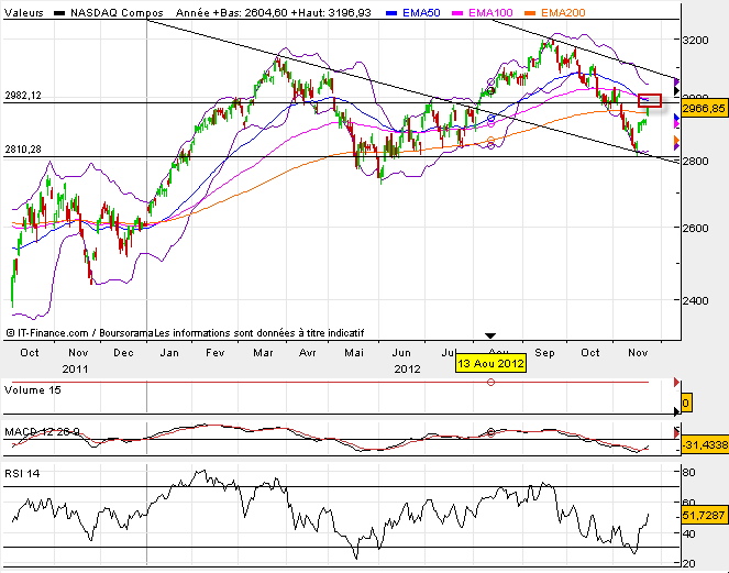 Une grande partie de l’atteinte des 3740 points en objectif semble être lié aux marchés américains. Leur tendance est loin d’être aussi positive que celle du CAC 40. Au contraire, de nous, les marchés américains semblent plutôt dans une forme de rebond technique, un pullback sur les anciennes cassures de support qui pourrait faire douter les marchés sur une poursuite du mouvement haussier. il faudra donc observer de près les 3000 points, et surtout après avoir consolider pour souffler, le fait que les marchés américains n’enfoncent pas les supports de novembre et repartent plutôt à la hausse pour franchir les 3000 points et donner l’élan au cac 40 d’atteindre les 3740 points.