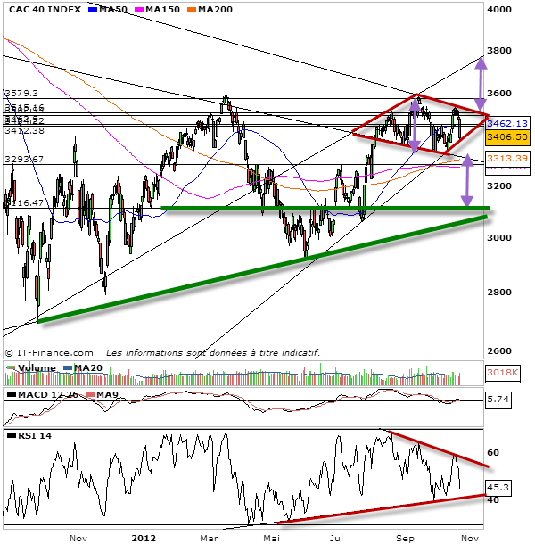 Force est de constater que ce soir le CAC 40 revient sur le support des 3390 points, celui-ci tient encore ce qui permet de tracer une figure en diamant.