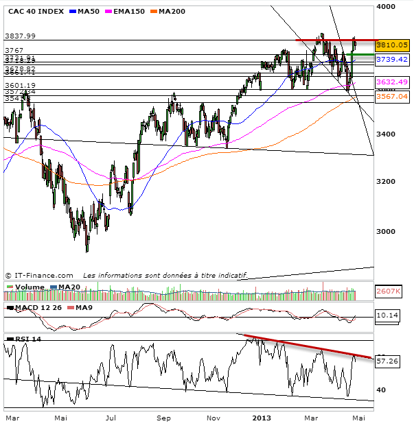 Soit le point haut est atteint, l’oblique de résistance sur le rsi est prédominante et le sera pendant de longs mois en cassant les 3757 puis 3737 points en relançant ainsi une baisse.